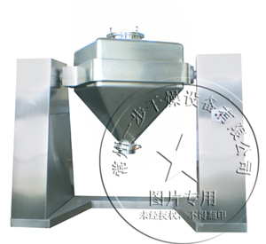 •将物料装入方锥形密闭混合桶内,料斗对称的轴线与回转轴轴线成一夹角,不同成份物料在密闭的料门中进行三维空间运动,产生强烈翻转和扩散作用,达到理想的混合效果。整机设计新颖、结构紧凑、外形美观、混合均匀度达99%,体积装料系数达0.8。
